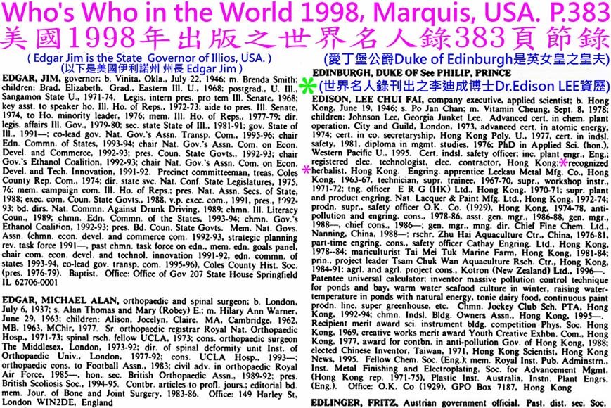 Who's Who in the World 1998 US↓在美國伊利諾州長之右,英菲臘親王之下